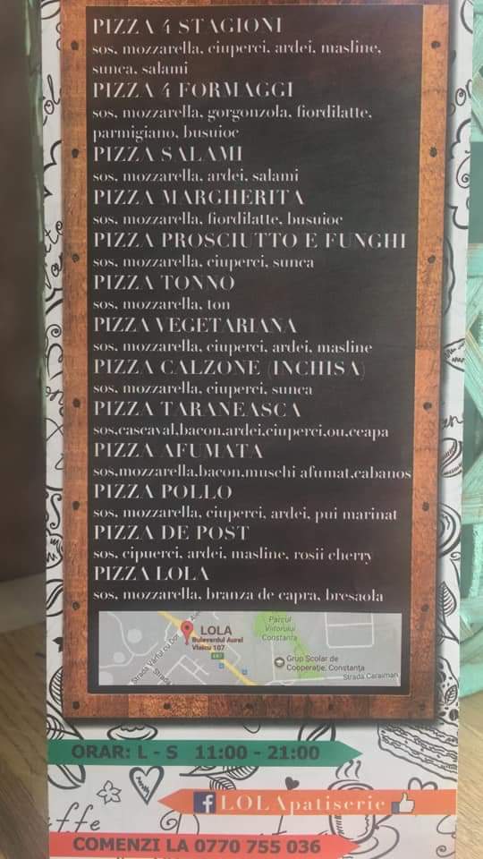 Welcome to Pizzeria LOLA, a delightful gem located at Bloc AV4, Bulevardul Aurel Vlaicu 107, Constanța. Known for its exceptional quality, this pizzeria excels in creating mouthwatering pizzas that have garnered rave reviews from satisfied customers.